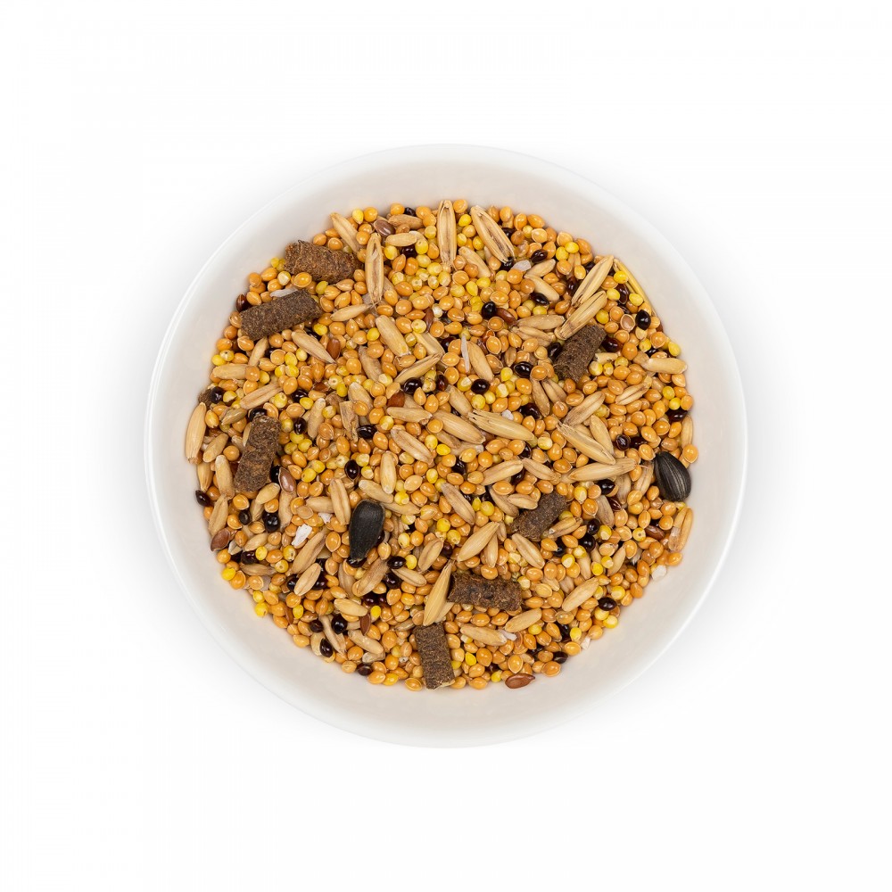 Склад: просо червоне, просо жовте, овес голозерний, просо чорне, канаркове насіння, насіння льону, кокосова стружка, насіння соняшнику, насіння конопель, яблука сушені гранульовані.