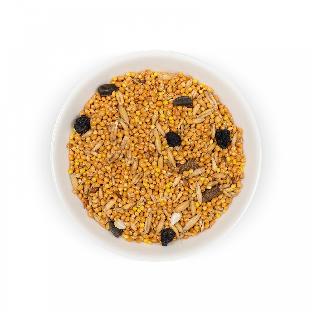 Склад: просо жовте, просо червоне, овес голозерний, канаркове насіння, насіння льону, сафлор, горобина, насіння соняшнику, сорго, насіння конопель, яблука сушені гранульовані, ехінацея.
