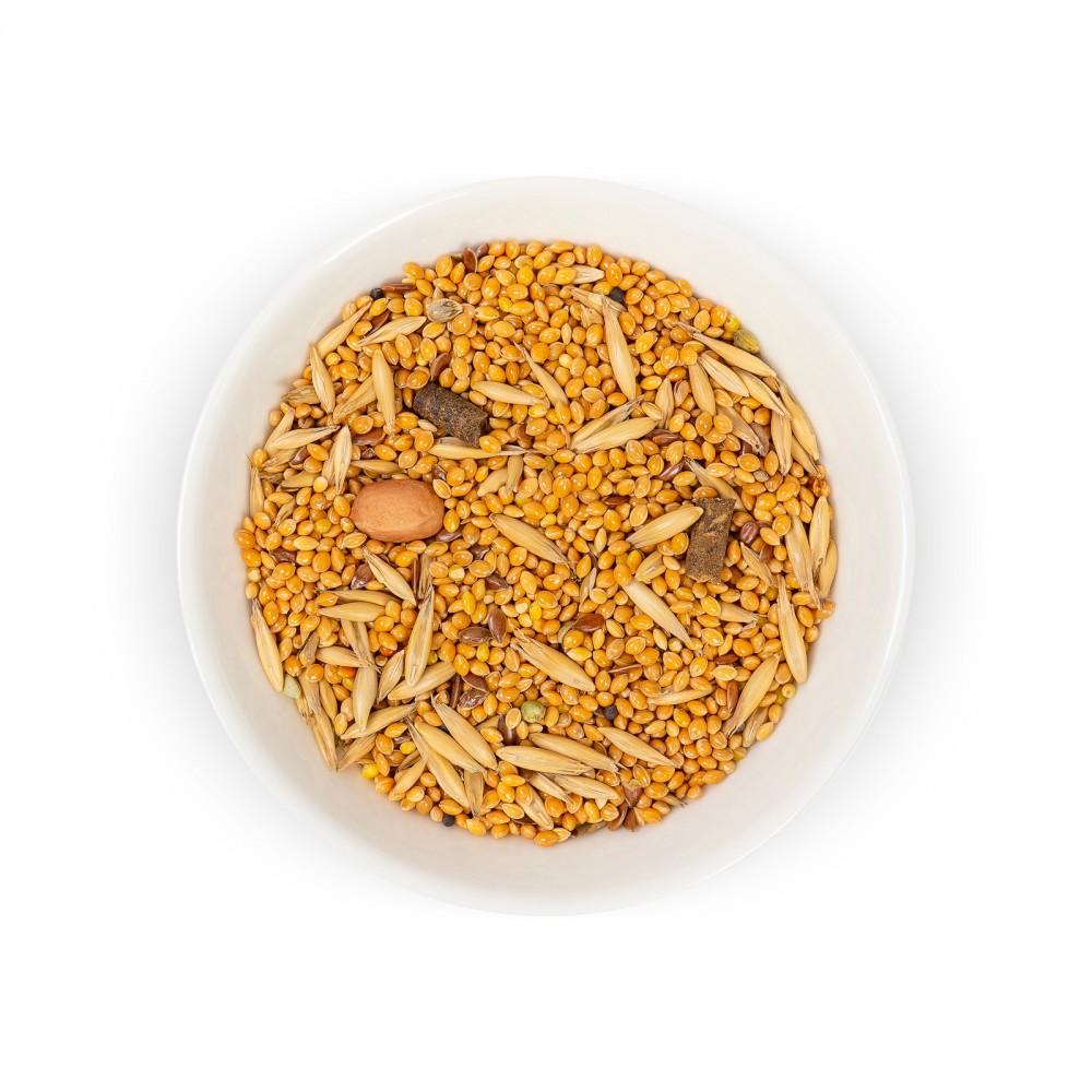 Склад: овес, насіння льону, ріпак, насіння конопель, арахіс, яблука сушені гранульовані, канаркове насіння, просо жовте, просо червоне.