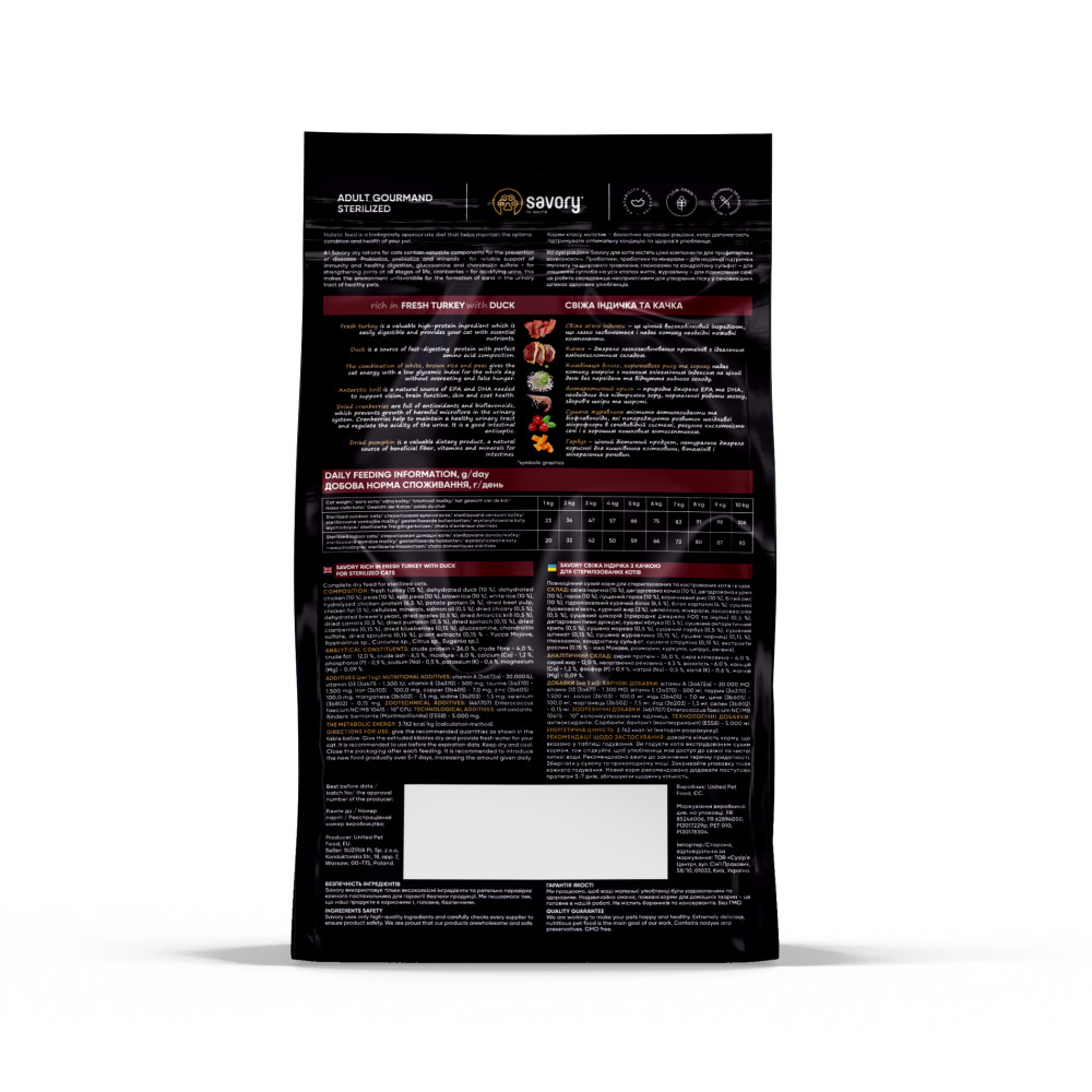 Сухий корм для котів Savory містить свіже м'ясо індички та дегідроване м'ясо качки, ягоди, фрукти та овочі. Ці компоненти створені природою, щоб піклуватися про здоров’я нирок і сечовивідних шляхів котика та підтримати його оптимальну фізичну форму.
