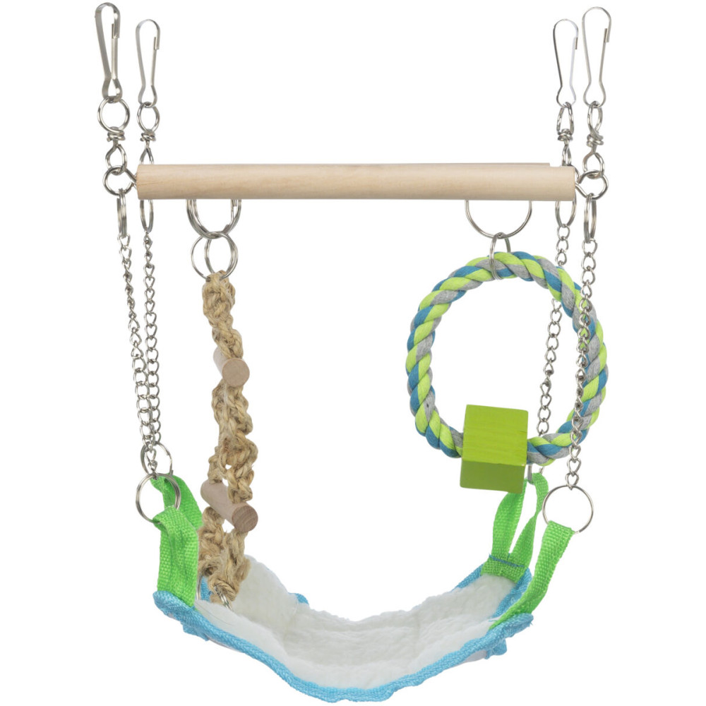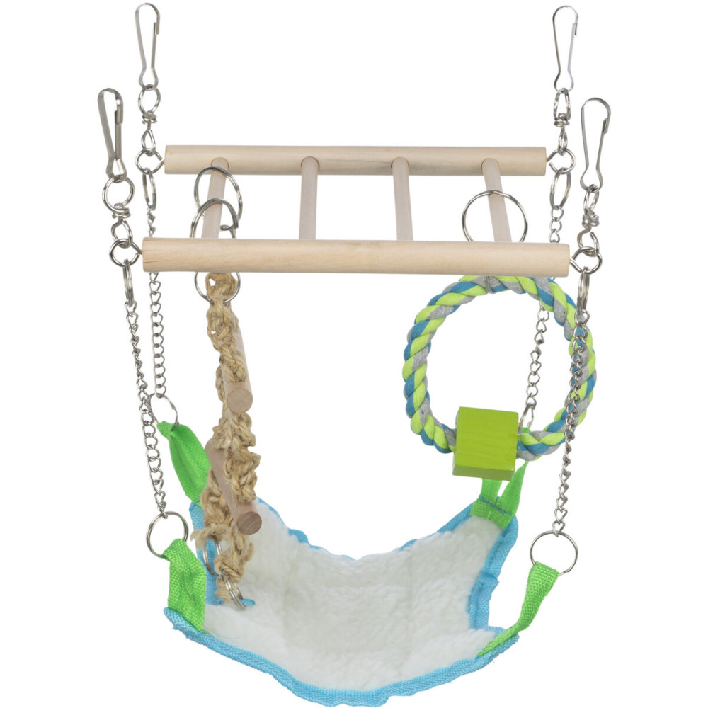Подвесной мост для хомяков Trixie – фантастический аттракцион, который развлечет вашего маленького пушистика. Состоит из деревянной лестницы с нейлоновым гамаком на приятной меховой подкладке, с веревочной лестницы и веревочного кольца с деревянным блоком.